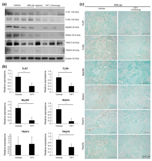 Toll-like receptor inhibitor peptide 1 (TIP1) blocks the endosomal Toll-like receptor 7 (TLR7)/TLR9 signaling pathway in the spleen. (a) The expression of the proteins of the endosomal TLR signaling was analyzed by Western blotting using spleen tissues from female lupus-prone mice (MRL/lpr). (b) The summarized bar graph shows the band intensity presented as the ratio of the target protein to actin (n = 4 mice/group). Values are means ± standard deviation (SD). * p < 0.05 by Mann–Whitney U test. (c) Immunohistochemistry was performed to detect endosomal TLR pathway proteins (brown) in the spleen (magnification, ×20). The experiments were repeated at least twice. MyD88, myeloid differentiation factor 88; IRAK4, interleukin-1 receptor-associated kinase 4; TRAF3, tumor necrosis factor receptor-associated factor 3; TRAF6, tumor necrosis factor receptor-associated factor 6.