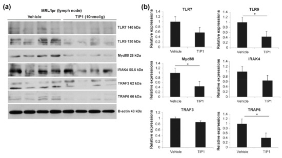 TLR7/9 binds to the adapter protein MyD88, which induces IRAK1 phosphorylation via IRAK4. IRAK1 interacts with TRAF3/6 and activates the IRF7 signaling pathway [23]. To investigate whether TIP1 treatment inhibits the TLR7/9/MyD88/IRF7 signaling pathway, we analyzed protein expression in major tissues and found that the expression of MyD88 and IRAK4 was significantly lower in the kidney tissues of TIP1-treated mice than in those of vehicle-treated mice (Figure 3b,c). In the spleen, the levels of TLR7, MyD88, IRAK4, and TRAF6, but not TRAF3, significantly decreased after TIP1 treatment (Figure 4a,b). The decrease in protein expression, including TRAF3 expression, in the spleen following TIP1 treatment was also observed by immunohistochemistry (Figure 4c). Next, we examined changes in TLR7/9/MyD88/IRF7 signaling pathway-related proteins in the lymph node and found that the levels of TLR9, MyD88, and TRAF6 significantly decreased in the lymph node of TIP1-treated mice (Figure 5a,b).