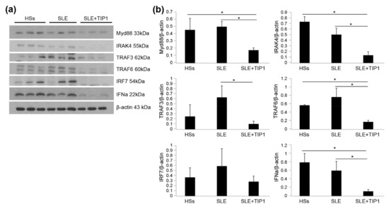 Inhibition of the Toll-like receptor (TLR) signaling pathway in peripheral blood mononuclear cells (PBMCs) of patients with systemic lupus erythematosus (SLE). (a) The expression of the proteins related to the TLR signaling was analyzed by Western blotting using PBMCs from patients with SLE (n = 3) and healthy subjects (HSs; n = 3). All 3 SLE patients were taking hydroxychloroquine 200 mg/d or 300 mg/d. Two SLE patients were not taking corticosteroids except one SLE patient taking prednisolone 2.5 mg/d. (b) Western blot data were quantified using a densitometer (* p < 0.05, Mann–Whitney U test). The experiments were repeated at least twice. TIP1, Toll-like receptor inhibitor peptide 1; MyD88, myeloid differentiation factor 88; IRAK4, interleukin-1 receptor-associated kinase 4; TRAF3, tumor necrosis factor receptor-associated factor 3; TRAF6, tumor necrosis factor receptor-associated factor 6; IRF7, interferon regulatory factor 7; IFN-α, interferon-α.
