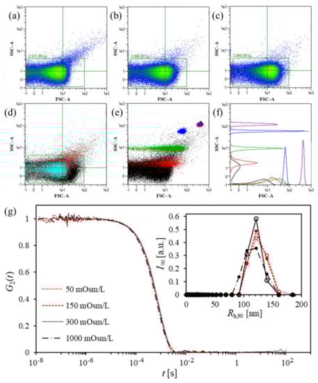 FCM and DLS/SLS analysis of hbEV isolates. (a–d) Scatterplot presenting forward (FSC–A) and side-scattering (SSC–A) signals of hbEV isolates suspended in media with different osmolarites (colour scale from blue to red pertains to increasing event density): 300 mOsm/L (a), 150 mOsm/L (b), 50 mOsm/L (c), and an overlay of scatterplots a–c (d): Light blue—300 mOsm/L, red—150 mOsm/L, black—50 mOsm/L. (e–f) An overlay of a scatterplot of a representative hbEV sample (300 mOsm/L PBS–citrate, black dots) and calibration beads of different sizes: red—0.5 μm, green—1 μm, blue—2 μm, and purple—3 μm; in (f,) distributions of events over FSC and SSC signals are presented normalized to the area under the curve; (g) the measured correlation functions G2(t) of the hbEVs in PBS–citrate with different osmolarities, as indicated in the figure. The scattered light was measured at a 90 ° angle and at a temperature of 25 °C. The corresponding distributions of the hydrodynamic radius were determined at a 90° angle, Rh,90, and are presented in the inset.