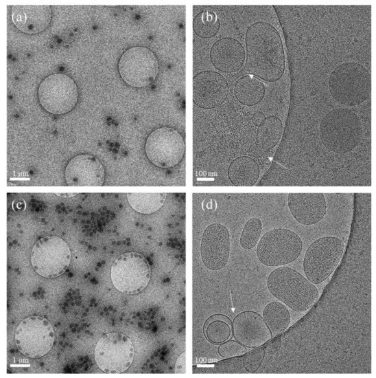 Cryo-TEM analysis of the hbEVs isolate (stored in 300 mOsm/L PBS–citrate at 4 °C) performed at 6 weeks and at more than 7 months after isolation further supports the indications that were obtained by DLS/SLS. The morphology of a large portion of hbEVs appeared to be conserved (Figure 4a–c), although some empty vesicles (Figure 4b,d) and some aggregates of the remnants of degraded vesicles were observed (Appendix B).