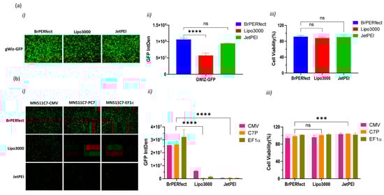 The newly generated plasmids were quite large (MN511C7-CMV: 15,974 bp, MN511C7-C7P: 15,414 bp, and MN511C7-EF1α: 16,819 bp). To deliver such large C7 plasmids (around 16 kb) efficiently, we selected and compared three non-viral commercial reagents for transfection on RDEB cells, including BrPERfect, Lipofectamine 3000 and jetPEI. All of them were formulated with gWiz-GFP plasmids or each MN511C7 plasmid, following their user manuals. Fluorescence images were taken 48 h post-transfection and processed for semi-quantitative analysis using Image J. The GFP expression from gWiz-GFP plasmid showed that all commercial reagents had very high transfection efficiency and good cytocompatibility on RDEBK (Figure 2a(i–iii)). BrPERfect and jetPEI, two polymer-based DNA vectors, showed no statistical differences for transfection efficiency on RDEBK cells (p = 0.0506), and their transfection ability was better than Lipofectamine 3000 (p ˂ 0.0001 when compared with BrBPERfect and p = 0.0002 when compared with jetPEI), which is a liposome (Figure 2a(i,ii)). However, all three reagents showed limited transfection efficiency on the RDEB fibroblasts (RDEBF) cells. Compared to GFP-positive RDEBK cells, only few RDEBF cells expressed GFP after transfection (Figure S2a). As mentioned earlier, the large size of the C7 sequence is the main obstacle for gene replacement therapy of RDEB. When we transfected RDEBK cells with MN511C7 plasmids, the transfection efficiency of all the reagents was reduced. Thus, less GFP positive cells were found when transfecting them with MN511C7 plasmids than with the gWiz-GFP plasmid. Particularly, the number of GFP-positive cells transfected with Lipofectamine 3000 and jetPEI sharply dropped. However, BrPERfect still showed high levels of transfection efficiency on RDEBK cells, which indicated its outstanding performance on DNA delivery (Figure 2b(i,ii)). All the transfections conducted here showed over 80% of cell viability in relation to the untreated cells (Figure 2a,b(iii) and Figure S2b). Based on these results, BrPERfect was the transfection reagent selected for further assays.
