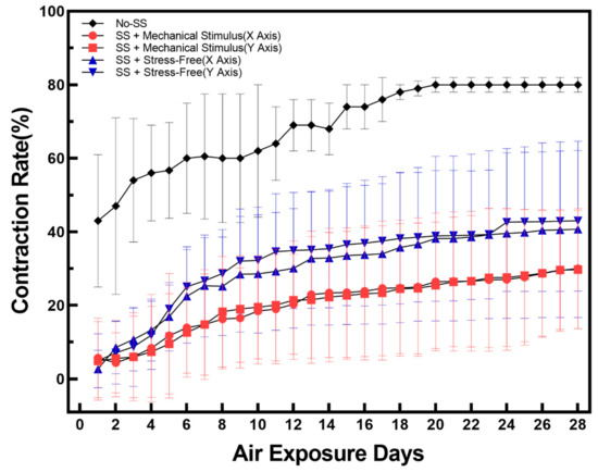 Variations of tissue contraction rate during 28 days of air exposure for three types of samples: No-SS means no sulfo-SANPAH treatment and no mechanical stimulus; SS + Mechanical Stimulus (X Axis) means sulfo-SANPAH treatment sample applied by along compressive stimuli direction; SS + Mechanical Stimulus (Y Axis) means sulfo-SANPAH treatment sample applied by along compressive stimuli direction; SS + Stress-free (X, Y Axis) means sulfo-SANPAH treatment sample without compressive stimuli. For each condition, the tissue contraction was calculated from eight chips and the average value was displayed. Error bars indicate standard error of the mean.