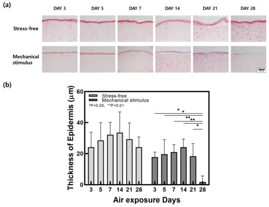 (a) H&E stained images and (b) epidermal thickness change in samples with and without compressive stimulation as a function of the air exposure days (Scale bar = 100 µm, n = 5, error bars = SEM, *, p < 0.05; **, p < 0.01).