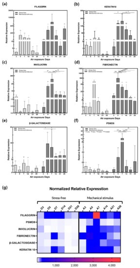 Relative gene expression of (a) filaggrin, (b) fibronectin, (c) involucrin, (d) keratin 10, (e) β-galactosidase, and (f) PSMD8 in samples with and without compressive stimulation as a function of the air exposure days. (g) Normalized relative expression for (a–f). (n = 5; *, p < 0.05; **, p < 0.01; ***, p < 0.001; ****, p < 0.0001).