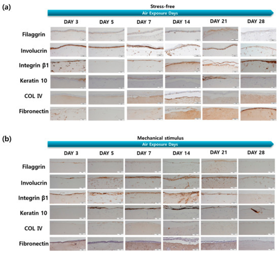 IHC stained images of the filaggrin, involucrin, integrin β-1, keratin 10, collagen IV, fibronectin for the samples (a) without and (b) with compressive stimulation for various air exposure days (Scale bar = 100 µm).