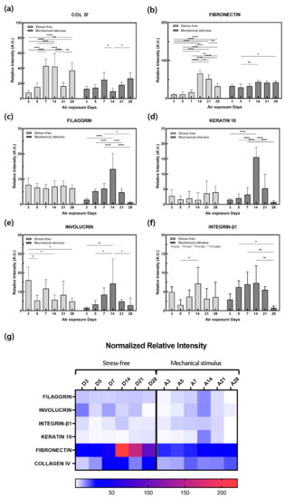 Quantitative analysis of IHC stained images of the (a) collagen IV, (b) fibronectin, (c) filaggrin, (d) keratin10, (e) involucrin, (f) integrin-β for the samples without and with compressive stimulation for various air exposure days. (g) Normalized relative intensity of (a–f). (n = 5; *, p < 0.05; **, p < 0.01; ***, p < 0.001; ****, p < 0.0001).