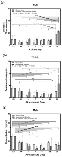 Variation of (a) ROS, (b) TGF-β1, (c) Myb secretion for the samples without and with compressive stimulation for various air exposure days. (n = 3; *, p < 0.05; **, p < 0.01; ***, p < 0.001; ****, p < 0.0001).