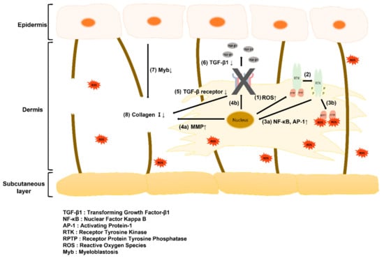The skin, which protects the body from the external environment, is subject to both intrinsic and extrinsic aging processes. Intrinsic aging is caused by metabolic processes that occur in the human body, and extrinsic aging encompasses changes associated with long-term exposure to environmental factors such as ultraviolet (UV) rays [1,2]. Intrinsic aging may result from exposure to reactive oxygen species (ROS), which form as part of metabolic processes in the body, and which may become damaging when accumulated. Extrinsic aging occurs in response to harmful ROS formed by exposure to UV rays [3,4,5]. Under general conditions, the activity of receptor tyrosine kinase (RTK) on the surface of skin cells is suppressed by receptor protein tyrosine kinase (RPTP). However, when exposed to UV rays, ROS are produced by the skin and bind to RPTP. RTK is then phosphorylated to induce secretion of nuclear factor kappa-light-chain-enhancer of activated B cells (NF-κB) and activator protein-1 (AP-1) transcription factor. This transcription factor reduces the production of transforming growth factor (TGF)-β receptor and collagen, increases matrix metalloproteinase (MMP) gene transcription, and reduces collagen content [3,6,7].