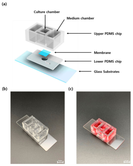 An upper polydimethylsiloxane (PDMS) (K-1 solution, Gwangmyeong, Korea) chip was manufactured by preparing a solution of PDMS using a 30:1 ratio of silicone elastomer base:silicone elastomer curing agent to confer flexibility. This was cured in an oven at 80 °C for 2 h. The lower PDMS chip was produced using a patterned master mold (width: 200 µm, height: 150 µm high) using a 10:1 ratio of silicone elastomer base:silicone elastomer curing agent. This was hardened in an oven at 80 °C for 1 h. The FSOC comprises an upper PDMS chip and a lower PDMS chip, between which a porous member (pore size: 0.4 µm; Corning Inc., New York, NY, USA) is placed (Figure 8). There is an 8-mm2 culture chamber in the center of the FSOC, which is used to cultivate cells in medium supplied through two medium chambers in the bottom membrane. Both medium chambers are filled with medium circulating through the lower channel [23,30,31,32,33,34].