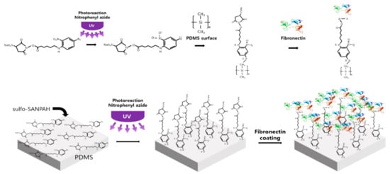 Schematic diagrams for a binding process of sulfo-SANPAH, Fibronectin and PDMS.