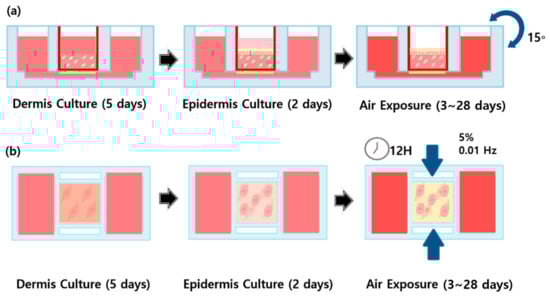 The dermal layer was mixed with a type I collagen solution (Corning Inc., New York, NY, USA) and 5.0 × 105 cell/mL fibroblasts and cultured in Dulbecco’s modified Eagle medium (DMEM; Gibco, New York, NY, USA) for 5 days (Figure 10). Next, 1.0 × 106 cell/keratinocytes were attached to the dermal layer, and the epidermal layer was formed using KGMTM and DMEM over 3 days. During the air exposure phase (air liquid interface exposure), in which cells are directly exposed to the air to induce differentiation [57,58,59], samples in the mechanical stimulus group were subjected to alternating periods of compression (12 h, 5% compressive strain at 0.01 Hz) and no compression (12 h) for 28 days. As the initial conditions of the mechanical stimulus, 3%, 5%, 7%, 10% compressive strain and 0.01 Hz, 0.005 Hz were set for the experiment. As a result of the experiment, under the conditions of 7% and 10% compressive strain, heat occurred in the motor of the machine during the experiment and collagen was melted by heat conduction. It was also confirmed that 0.01 Hz controlled more tissue contraction than 0.005 Hz. Therefore, we adopted 5% compressive strain, 0.01 Hz as the final condition of the mechanical stimulus. Control samples were turned every 30 s at an angle of 15° for 28 days. During this period, samples were cultured in E-media comprising DMEM/Ham’s F12 (Gibco), 10 ng/mL epidermal growth factor (EGF)-1, 0.4 µg/mL hydrocortisone, 5 µg/mL insulin, 5 µg/mL transferrin, 2 × 10−11 M 3,3,5-triiodo-L-thyonine sodium salt, 10−10 M cholera toxin, 10% (v/v) fetal bovine serum (FBS), and 1% penicillin/streptomycin.