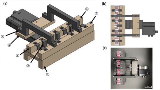 Schematic diagrams (a,b) and actual photograph (c) of the mechanical stimulus actuating system: ① Rack, ② Suspension, ③ Bottom plate, ④ Fixed top plate, ⑤ Moving top plate, ⑥ Bridge plate, ⑦ Bridge.