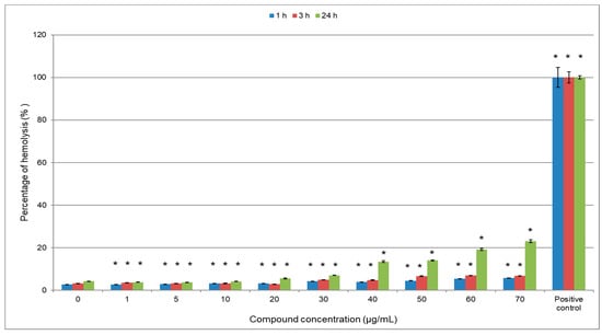 4.2.3. Assessment of the Haemolytic Activity of Carbazole Derivative 2