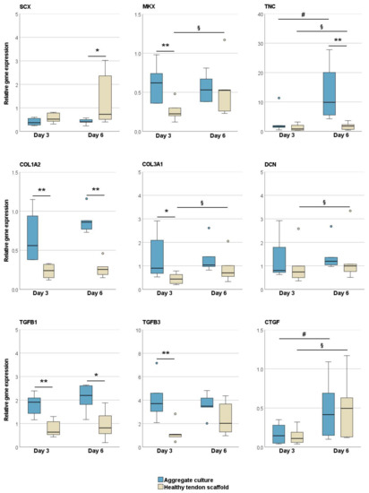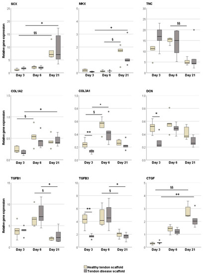 Relative gene expression of tendon-related genes and growth factors in MSCs seeded on healthy and diseased tendon scaffolds. Asterisks indicate significant differences between groups with p < 0.05 (*) or p < 0.01 (**). Significant differences over time are indicated by paragraph symbols for healthy tendon scaffold cultures and by plus symbols for diseased tendon scaffold cultures (§ or + for p < 0.05; §§ or ++ for p < 0.01). Data were obtained using scaffolds from n = 5 different tendons per group. SCX: scleraxis; MKX: mohawk; TNC: tenascin-C; COL1A2: collagen I; COL3A1: collagen III; DCN: decorin; TGFB: transforming growth factor-β; CTGF: connective tissue growth factor.