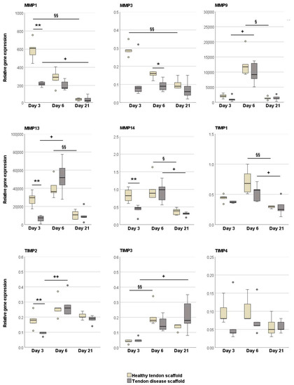 Relative gene expression of matrix metalloproteinases (MMPs) and tissue inhibitors of metalloproteinases (TIMPs) in MSCs seeded on healthy and diseased tendon scaffolds. Asterisks indicate significant differences between groups with p < 0.05 (*) or p < 0.01 (**). Significant differences over time are indicated by paragraph symbols for healthy tendon scaffold cultures and by plus symbols for diseased tendon scaffold cultures (§ or + for p < 0.05; §§ or ++ for p < 0.01). Data were obtained using scaffolds from n = 5 different tendons per group.
