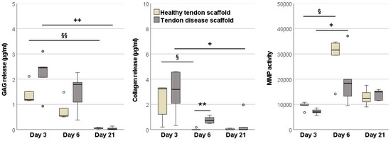 Glycosaminoglycan, total collagen, and matrix metalloproteinase (MMP) activity in the supernatants of healthy and diseased tendon scaffold cultures. Asterisks indicate significant differences between groups with p < 0.01 (**). Significant differences over time are indicated by paragraph symbols for healthy tendon scaffold cultures and by plus symbols for diseased tendon scaffold cultures (§ or + for p < 0.05; §§ or ++ for p < 0.01). Data were obtained using scaffolds from n = 5 different tendons per group.