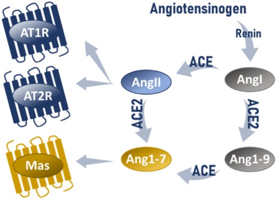 - Forrester, S.J.; Booz, G.W.; Sigmund, C.D.; Coffman, T.M.; Kawai, T.; Rizzo, V.; Scalia, R.; Eguchi, S. Angiotensin II Signal Transduction: An Update on Mechanisms of Physiology and Pathophysiology. Physiol. Rev. 2018, 98, 1627–1738. [Google Scholar] [CrossRef] [PubMed]