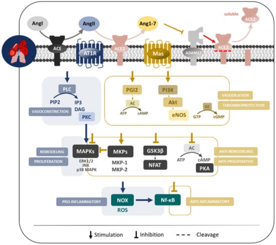 - Tallant, E.A.; Ferrario, C.M.; Gallagher, P.E. Angiotensin-(1-7) inhibits growth of cardiac myocytes through activation of the mas receptor. Am. J. Physiol. Heart Circ. Physiol. 2005, 289, H1560–H1566. [Google Scholar] [CrossRef] [PubMed]