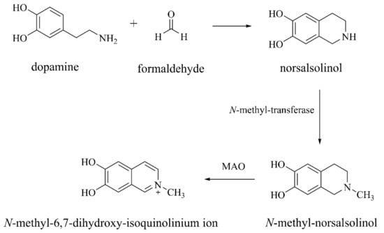 - Mravec, B. Salsolinol, a derivate of dopamine, is a possible modulator of catecholaminergic transmission: A review of recent developments. Physiological Research 2006, 55, 353–364. [Google Scholar]