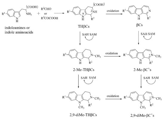 - Matsubara, K.; Collins, M.A.; Akane, A.; Ikebuchi, J.; Neafsey, E.J.; Kagawa, M.; Shiono, H. Potential bioactivated neurotoxicants, N-methylated beta-carbolinium ions, are present in human brain. Brain Res. 1993, 610, 90–96. [Google Scholar] [CrossRef]