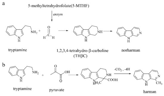 - Pfau, W.; Skog, K.J. Exposure to β-carbolines norharman and harman. J. Chromatogr. B 2004, 802, 115–126. [Google Scholar] [CrossRef]