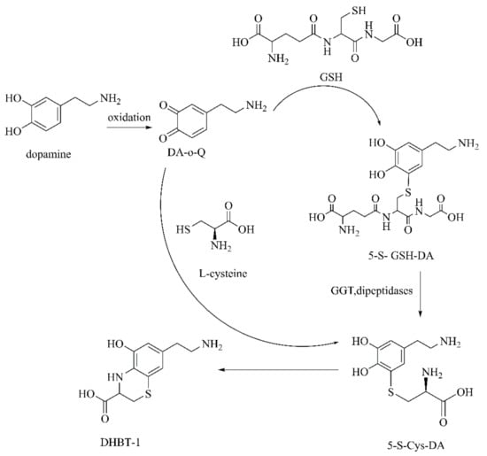 - Jameson, G.N.L.; Zhang, J.; Jameson, R.F.; Linert, W. Kinetic evidence that cysteine reacts with dopaminoquinone via reversible adduct formation to yield 5-cysteinyl-dopamine: An important precursor of neuromelanin. Org. Biomol. Chem. 2004, 2, 777–782. [Google Scholar] [CrossRef]