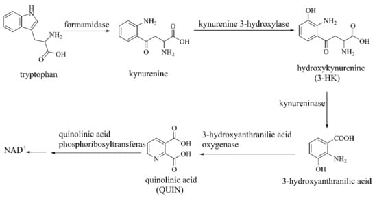 - Lugo-Huitron, R.; Ugalde Muniz, P.; Pineda, B.; Pedraza-Chaverri, J.; Rios, C.; Perez-de la Cruz, V. Quinolinic acid: An endogenous neurotoxin with multiple targets. Oxid. Med. Cell. Longev. 2013, 2013, 104024. [Google Scholar] [CrossRef] [PubMed]
