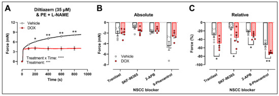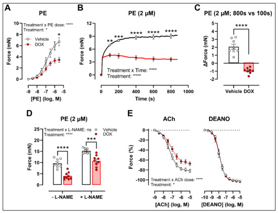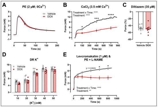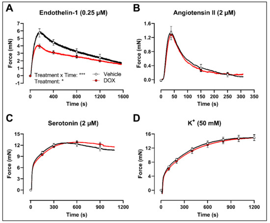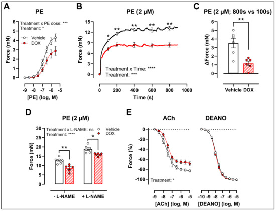2.1. A Single Dose of DOX Impairs VSMC Contraction and Endothelium-Dependent Vasodilation