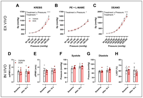 2.4. A Single Dose of DOX Decreases Ex Vivo Arterial Stiffness but Not In Vivo Arterial Stiffness and Blood Pressure