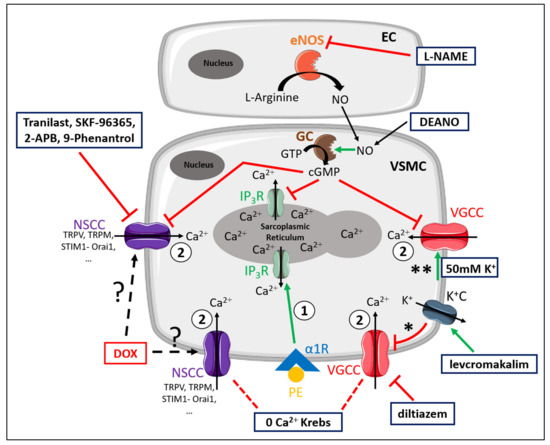 - Shen, B.; Ye, C.L.; Ye, K.H.; Zhuang, L.; Jiang, J.H. Doxorubicin-induced vasomotion and [Ca(2+)](i) elevation in vascular smooth muscle cells from C57BL/6 mice. Acta Pharmacol. Sin. 2009, 30, 1488–1495. [Google Scholar] [CrossRef]