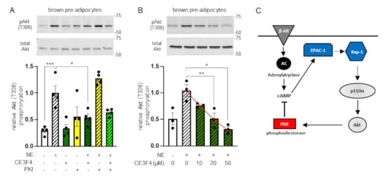 - Zmuda-Trzebiatowska, E.; Manganiello, V.; Degerman, E. Novel mechanisms of the regulation of protein kinase B in adipocytes; implications for protein kinase A, Epac, phosphodiesterases 3 and 4. Cell Signal 2007, 19, 81–86. [Google Scholar] [CrossRef][Green Version]