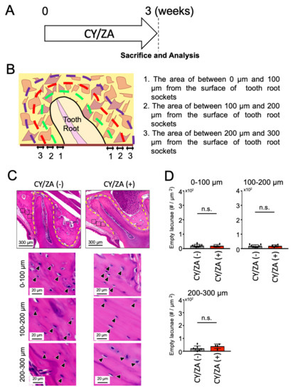 To understand whether CY/ZA administration could induce a MRONJ-like condition, the alveolar bone around the maxillary first molars were analyzed after three weeks of CY/ZA administration in mice (Figure 1A). The number of empty lacunae was counted in the surrounding alveolar bone at different distances (0–100 µm, 100–200 µm and 200–300 µm) from the lateral boundaries of the tooth root socket (Figure 1B). There was no significant difference in the number of empty lacunae in the control group (no therapy) compared to CY/ZA therapy group (Figure 1C,D). From these results, it was clarified that administration of CY/ZA for only three weeks cannot induce alveolar bone necrosis.