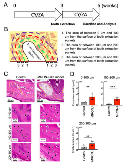 Effect of CY/ZA administration on the alveolar bone around the tooth extraction socket after two weeks of tooth extraction. (A) Experimental design: CY/ZA were administered for three weeks and continued for two weeks after extraction of the maxillary first molar. CY: cyclophosphamide, ZA: zoledronate. (B) Graphic image of the selected bone areas around the tooth extraction socket. Green, Red and purple lines represent the areas at 0 µm to 100 µm, 100 µm to 200 µm and 200 µm to 300 µm from the surface of the tooth socket, respectively. (C) HE-stained sagittal images of the bone surrounding the tooth extraction socket of control and MRONJ-like model (CY/ZA administration). Yellow line indicates the tooth extraction socket. Black and white arrowheads represent lacunae with and without cells in the bone, respectively. (D) The graph represents the quantitative analysis of empty lacunae in the bone surrounding the tooth extraction socket. The number of empty lacunae was significantly increased in the experimental group compared to that in the control group. The bars represent the mean ± standard deviation. *** p < 0.001, ** p < 0.01. unpaired Students’ t-test. n = 4–7.