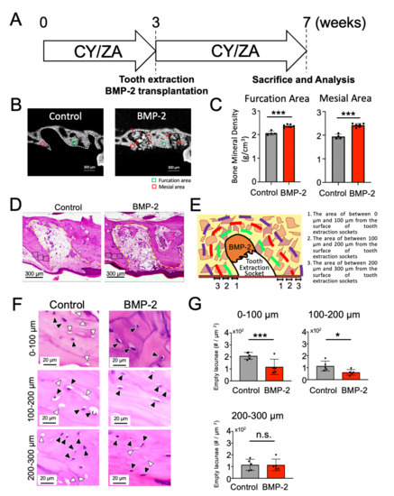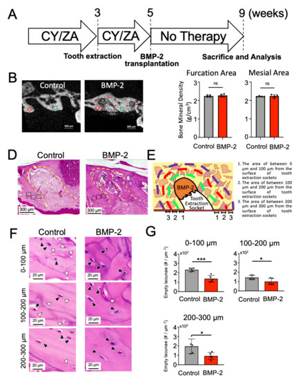 To explore the effect of BMP-2/β-TCP on MRONJ-associated bone loss around the tooth extraction socket after CY/ZA administration, BMP-2/β-TCP was transplanted after two weeks of extraction of the maxillary first molar, with a concomitant suspension of the CY/ZA administration (Figure 4A). Analysis was performed after four weeks of BMP-2/β-TCP transplantation (Figure 4A). In the micro-CT analysis, there was no significant difference in BMD between the BMP-2-transplanted group [furcation area (2.30 ± 0.14), mesial area (2.27 ± 0.13)] and the control group [furcation area (2.33 ± 0.15), mesial area (2.29 ± 0.14)] (Figure 4B,C). However, the number of empty lacunae in the BMP-2/β-TCP-transplanted group (138 ± 15.7, 100 ± 15.4, 93.1 ± 16.3, at 0 µm to 100 µm, 100 µm to 200 µm and 200 µm to 300 µm from the surface of tooth extraction socket, respectively) was significantly lower compared to that in the control group (233 ± 8.08, 144 ± 10.6, 195 ± 34.4, at 0 µm to 100 µm, 100 µm to 200 µm and 200 µm to 300 µm from the surface of tooth extraction socket, respectively) (Figure 4F,G). Note that the tooth extraction socket in the control group was filled with soft tissue, while BMP-2/β-TCP transplantation could promote partial bone repair. These results suggest that transplantation of BMP-2/β-TCP could ameliorate the bone necrosis around the extraction socket in the treatment of MRONJ-like symptoms.