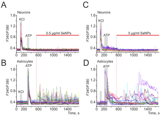 SeNPs dose-dependently induce the generation of Ca2+ signals in astrocytes, but not in neurons of various parts of the brain. (A–D) Generation of Ca2+ signals in astrocytes (B,D) in response to the application of 0.5 and 5 µg/mL SeNPs, respectively; (A,C) absence of Ca2+ signals in neurons. Ca2+ signals in neurons and astrocytes in response to SeNPs application in one experiment are presented here.