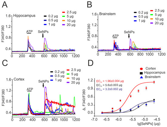 Dose-dependent change in the amplitude of Ca2+ signals in response to the application of SeNPs in astrocytes obtained from different parts of the mouse brain. (A–C) Ca2+ signals of astrocytes obtained from the hippocampus (A), brainstem (B), and cortex (C) for application of various concentrations of SeNPs (0.2–20 µg/mL). (D) Dependence of the amplitude of Ca2+ responses of astrocytes from different parts of the brain on the growth of SeNPs concentration and its approximation by a sigmoid function. Neuroglial cultures of different parts of the brain were obtained from one mouse and cultured under the same conditions. For (A–C), Ca2+ signals averaged over several tens of astrocytes are presented. To plot dose dependences, we used the results of Ca2+-dynamic measurements on three independent cell cultures.