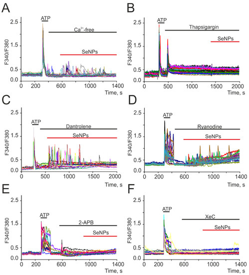 Generation of Ca2+ signals in cortical astrocytes in neuroglial culture in response to the application of 0.5 μg/mL SeNPs in calcium-free medium containing 0.5 mM EGTA (A), after depletion of ER with thapsigargin (B, 10 μM), in the presence of ryanodine receptor antagonists dantrolene (C, 30 μM) and ryanodine (D, 100 μM) and IP3R inhibitors 2-APB (E, 30 µM) and xestospongin C (F, XeC, 3 µM). Here, Ca2+ signals of astrocytes in one experiment are presented.
