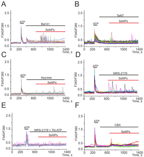 Suppression of Ca2+ signals in cortical astrocytes in response to the application of 0.5 µg/mL SeNPs in the presence of a vesicular secretion blocker bafilomycin A1 (A, Baf A1, 10 µM), tetanus toxin (B, TeNT, 100 µg/mL), an inhibitor of Ca2+-dependent vesicular fusion, apyrase (C, 30 U/mL), an enzyme that breaks down ATP, P2Y receptor antagonist MRS-2179 (D, 30 µM), combination MRS-2179 with P2X receptor antagonist TN-ATP (E, 10 µM), and connexin blocker carbenoxolone (F, CBX, 100 µM). Here, Ca2+ signals of cells in one experiment are presented.