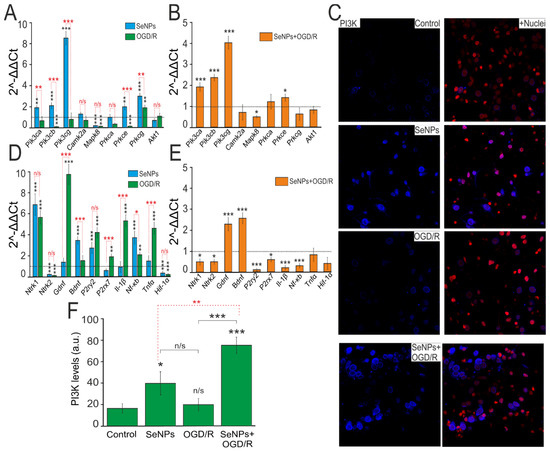 Effect of OGD (40 min) with 24 h reoxygenation (OGD/R), 24 h incubation of cortical cells with 0.5 μg/mL SeNPs (SeNPs), and 24 h incubation with 0.5 μg/mL SeNPs with OGD/R (SeNPs+OGD/R) on the level expression of genes encoding signal kinases (A,B), receptors, neurotrofins, and proinflammatory factors (D,E). Dashed line for (A,D) indicates level of gene expression in controls (without treatments). Dashed line for (B,E) indicates level of gene expression in OGD/R cortical cultures. Statistical significance was assessed using paired t-test. n/s—data not significant (p > 0.05), * p < 0.05, ** p < 0.01, and *** p < 0.001. (C) Immunostaining of PI3K in cells of the cerebral cortex in the control, after 24 h of incubation with 0.5 μg/mL SeNPs, and after OGD/R and OGD/R after 24 h of incubation with SeNPs+Nuclei—Draq5 nuclei staining. (F) Intensity levels of PI3K were determined by confocal imaging. We analyzed individual cells that had fluorescence of secondary antibodies. The quantitative data reflecting the level of PI3K expression are presented as fluorescence intensity values in summary bar charts (mean +/− SEM). The values were averaged by 200 cells for each column. The results obtained after immunostaining agree well with the data of fluorescence presented in (C). Each value is the mean ± SE (n ≥ 3, p < 0.05). Statistical significance was assessed using paired t-test. Comparison with control, *** p-level < 0.001, * p-level < 0.05, n/s—data not significant (p > 0.05).