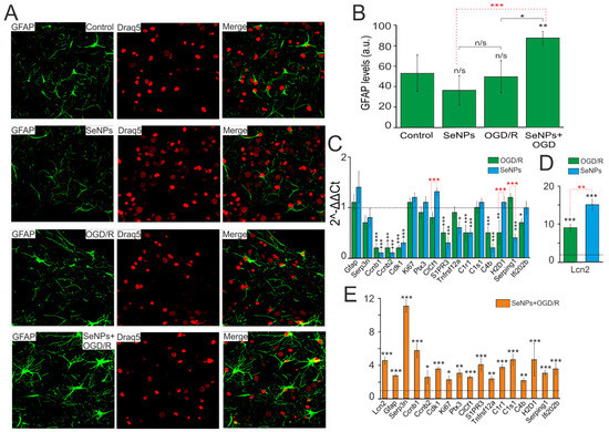 According to the results of real-time PCR, we can conclude, firstly, that in the neuroglial culture of the mouse cerebral cortex under OGD/R conditions (Figure 7C, green bars) and after 24 h incubation with SeNPs (Figure 7C, blue bars), no increase in the expression of key markers of astrocyte reactivation was observed, except for the gene encoding the secreted lipophilic protein Lcn2 (Figure 7D). The expression of Lcn2 mRNA increased 9 and 15 times during OGD and incubation with SeNPs, respectively; however, despite the fact that this protein, according to some data [30,31], is involved in reactive astrocyte gliosis, a significant decrease in the expression of other markers may indicate about the absence of reactive astrogliosis in the studied samples.
