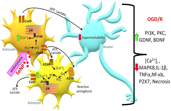Thus, application of SeNPs induces the generation of Ca2+ signals in astrocytes through the mobilization of Ca2+ ions from the ER via IP3R upon activation of the phosphoinositide signaling pathway. An increase in [Ca2+]i in the astrocyte causes Ca2+-dependent ATP secretion and lactate release through the Cx43 connexin chemical channels (Figure 8). As a result, paracrine activation of the entire astrocyte network and suppression of OGD-induced hyperexcitation of neurons occurs. Prolonged incubation of cerebral cortex cells with SeNPs leads to inhibition of OGD-induced global increase in [Ca2+]i and necrotic death through activation of reactive astrogliosis and expression of genes encoding cytoprotective proteins.