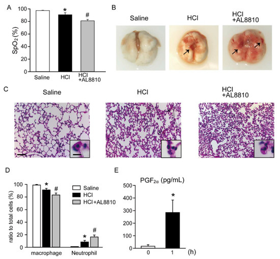Pretreatment with AL8810 promoted HCl-induced lung inflammation. AL8810 (10 mg/kg, i.p.) was administered to mice 1 h before HCl (0.1 M, 2 µL/g, i.t.) administration. (A) SpO2 level was used as a measure of pulmonary function (n = 3–4). * p < 0.05 vs. saline, # p < 0.05 vs. HCl. (B) Representative images of the lung tissues of saline-, HCl-, and HCl + AL8810-administered mice (n = 4–8). (C) Representative images of HE-stained sections of the lung tissues of saline-, HCl-, and HCl + AL8810-treated mice (scale bar 50 µm) (n = 6–10). (D) The cell numbers in BALF were measured at 6 h after administration of saline or HCl (n = 5–6). * p < 0.05 vs. saline, # p < 0.05 vs. HCl. (E) The PGF2α levels in BALF were measured by ELISA (n = 6). * p < 0.05 vs. 0 h.
