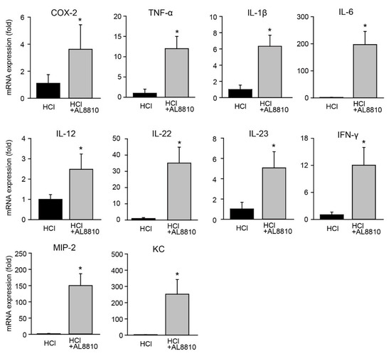 Administration of AL8810 promoted the expression of pro-inflammatory mediators. AL8810 (10 mg/kg, i.p.) was administered to mice at 1 h prior to HCl (0.1 M, 2 µL/g, i.t.) administration. The lung was extracted at 6 h after HCl administration. The gene expression levels of COX-2, TNF-α, IL-1β, IL-6, IL-12, IL-22, IL-23, IFN-γ, MIP-2, and KC in the lungs of HCl- and AL8810-treated mice were measured (n = 7). * p < 0.05 vs. HCl.