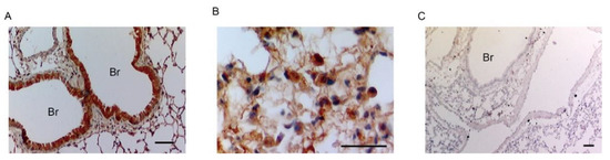 FP receptors were expressed on bronchial epithelium and in alveolar macrophage-like cells. The lung was extracted at 6 h after HCl administration. (A,B) Representative images of FP receptor-stained lung sections of HCl-treated mice (Br: bronchus, scale bar: 25 µm). (C) Representative stained image of the lung without the primary antibody (n = 5).