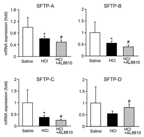 Inhibition of FP receptors decreased the gene expression of SFTP. AL8810 (10 mg/kg, i.p.) was administered to mice at 1 h before HCl (0.1 M, 2 µL/g, i.t.) administration. The lung was extracted at 6 h after administration of saline or HCl. The gene expression levels of SFTP-A, SFTP-B, SFTP-C, and SFTP-D in the lungs of saline-, HCl-, and HCl+AL8810-treated mice were determined by qPCR (n = 6–8). * p < 0.05 vs. saline, # p < 0.05 vs. HCl.