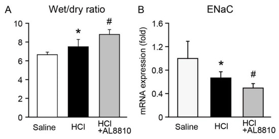 Lung edema is often observed in patients with ALI and is associated with mortality. We thus examined whether an FP receptor antagonist affects lung edema. Administration of HCl increased the wet/dry weight ratio in the lungs, indicating that HCl administration enhanced lung edema (Figure 5A). In addition, pre-administration of AL8810 significantly enhanced HCl-induced lung edema (Figure 5A). The epithelium sodium channel (ENaC) has a pivotal role in lung edema in ARDS/ALI [21]. Activation of ENaC attenuated LPS-induced ALI in mice [23,24]. We examined the effect of AL8810 on the gene expression of ENaC in the lungs. Administration with HCl decreased the gene expression of ENaC, as compared with saline-treated mice, which was further diminished in AL8810-pre-administered mice (Figure 5B).
