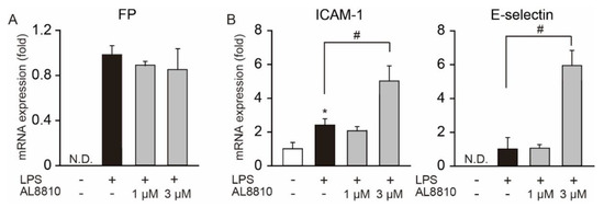 In patients with ALI, the expression levels of adhesion molecules in the epithelium, such as ICAM-1 and E-selectin, are increased [25]. An increase in the expression of ICAM-1 and E-selectin causes infiltration of inflammatory cells to tissues from blood vessels [26]. We first examined whether FP receptors are expressed in HUVECs. FP receptors were not expressed in no-treated HUVECs (Figure 6A). LPS stimulation upregulated the mRNA expression of FP receptors, but there were no differences in their expression levels between LPS- and LPS+AL8810-stimulated cells (Figure 6A). We then assessed the effect of AL8810 on the expression of adhesion molecules in HUVECs. Administration of LPS increased the gene expression of ICAM-1 in HUVECs, compared with no-treated cells (Figure 6B). In contrast, E-selectin gene expression was not detected in no-treated cells. Pretreatment with 3 µM AL8810 elevated the expression levels of both ICAM-1 and E-selectin, as compared with those in LPS-stimulated cells. These results suggest that treatment with AL8810 increased the LPS-induced expression levels of ICAM-1 and E-selectin in endothelial cells.