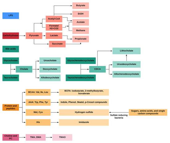 Microbial metabolites derived from dietary components (e.g., dietary fiber, cholesterol, amino acids) are involved in the development of metabolic diseases including IR and T2D [7]. Among dietary components, carbohydrates are fermented by microbes in the proximal colon, while the fermentation of protein mainly takes place in the distal colon; the latter occurs as the more easily digested carbohydrates are depleted, where little is known about the microbial networks that produce bile acids, choline, saccharolytic and proteolytic metabolites. Briefly, the fermentation of dietary fiber produces high amounts of short-chain fatty acids (SCFAs), lactate, succinate and gases, such as methane and carbon dioxide in the proximal colon [8]. In contrast, residual peptides and proteins, bile acids, and choline are fermented in the distal colon [9]. Compared to the fermentation of carbohydrates in the proximal colon, the fermentation products in the distal colon seems to be more diverse, including the following: (1) bacterial toxins such as lipopolysaccharides (LPS); (2) gaseous products like methane, carbon dioxide, and hydrogen sulfide; (3) bile acids (BA) products like deoxycholate and lithocholate; (4) branched-chain amino acids (BCAAs) and products like branched-chain fatty acids (BCFAs) isobutyrate, 2-methylbutyrate and isovalerate; (5) aromatic amino acids (AAAs) products like phenolic, indolic, skatolic and p-cresolic compounds as well as ammonia and polyamines and (6) choline products like and dimethylamine (DMA) and trimethylamine (TMA); (Figure 1). Studies have also measured the concentration of these microbial metabolites in serum, urine and feces, and the colon of humans (adults) (Table 1), which facilitate biological studies of microbial metabolites on host health.
