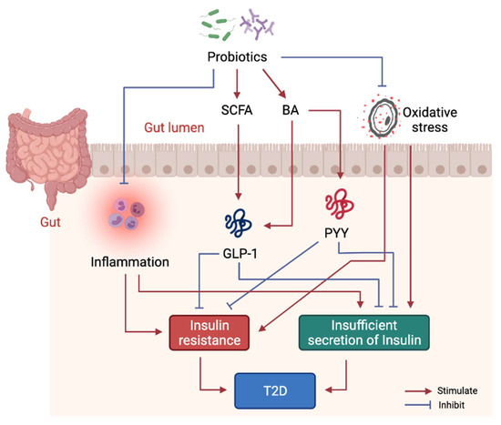Molecular mechanism of probiotics intervention on T2D. Probiotics in gut help produce beneficial metabolites including SCFA and some BA to stimulate GLP-1 and PYY secretion, thus, to alleviate insulin resistance and dysfunction of insulin secretion. Probiotics also suppress systemic inflammation by modulating gut microbiota structure.
